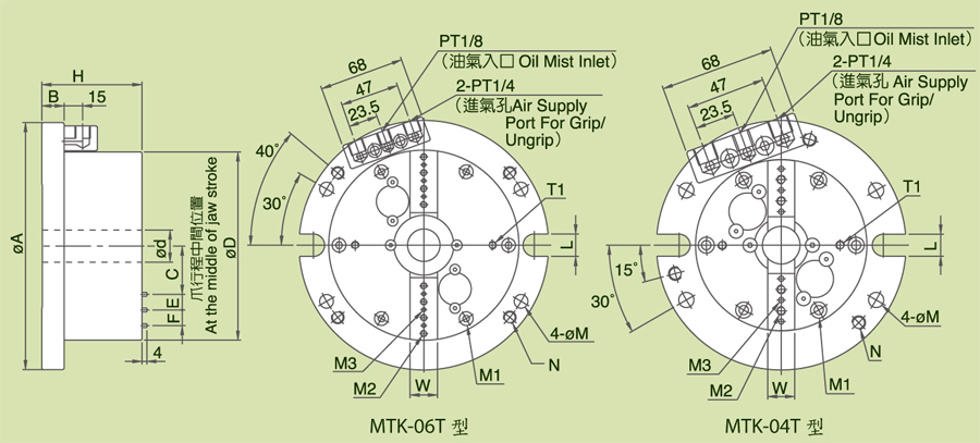 | MTK-06T | 200 | 18 | 39.75 | 152.4 | 26 | 12.7 | 12.7 | 81 | 22 | 18 | Ø11 (PCDØ180) | 6-M6×1P(PCDØ135.89) | 8-M5×0.8P | 6-Ø3.18 |